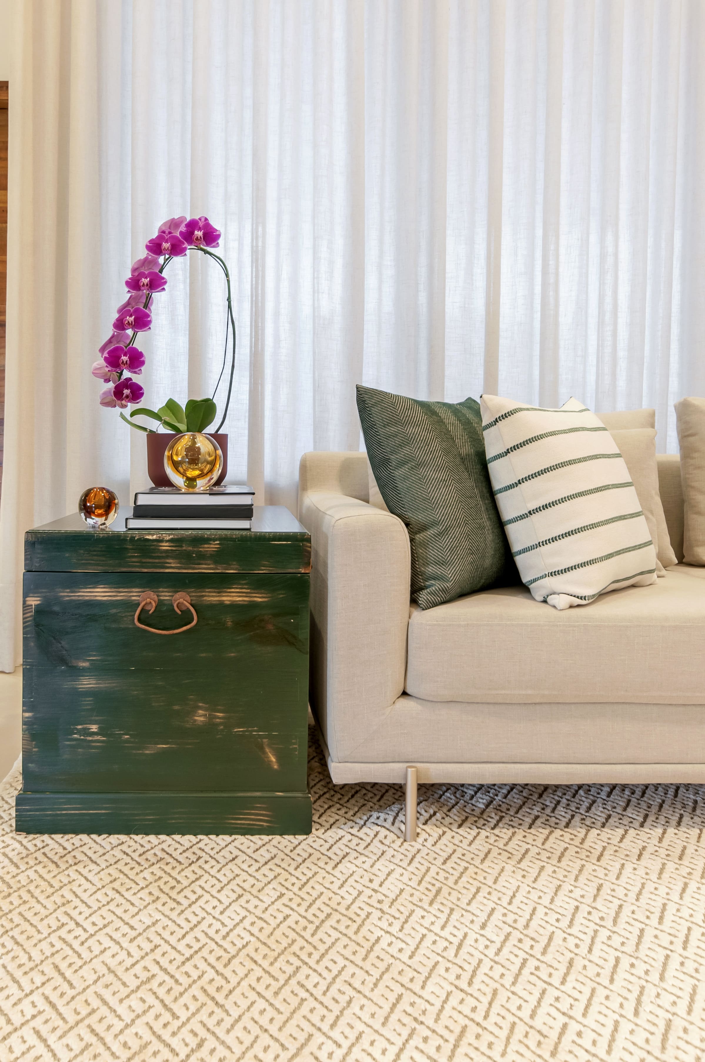 No amplo living assinado pelas arquitetas Claudia Passarini e Vanessa Paiva, do escritório Paiva e Passarini Arquitetura, o verde musgo realçou o par poltonas com pés palito em serralheria. Nos detalhes, a cor também se destaca no baú envelhecido, posicionado como mesa lateral, almofadas e os arranjos naturais | Foto: Xavier Neto