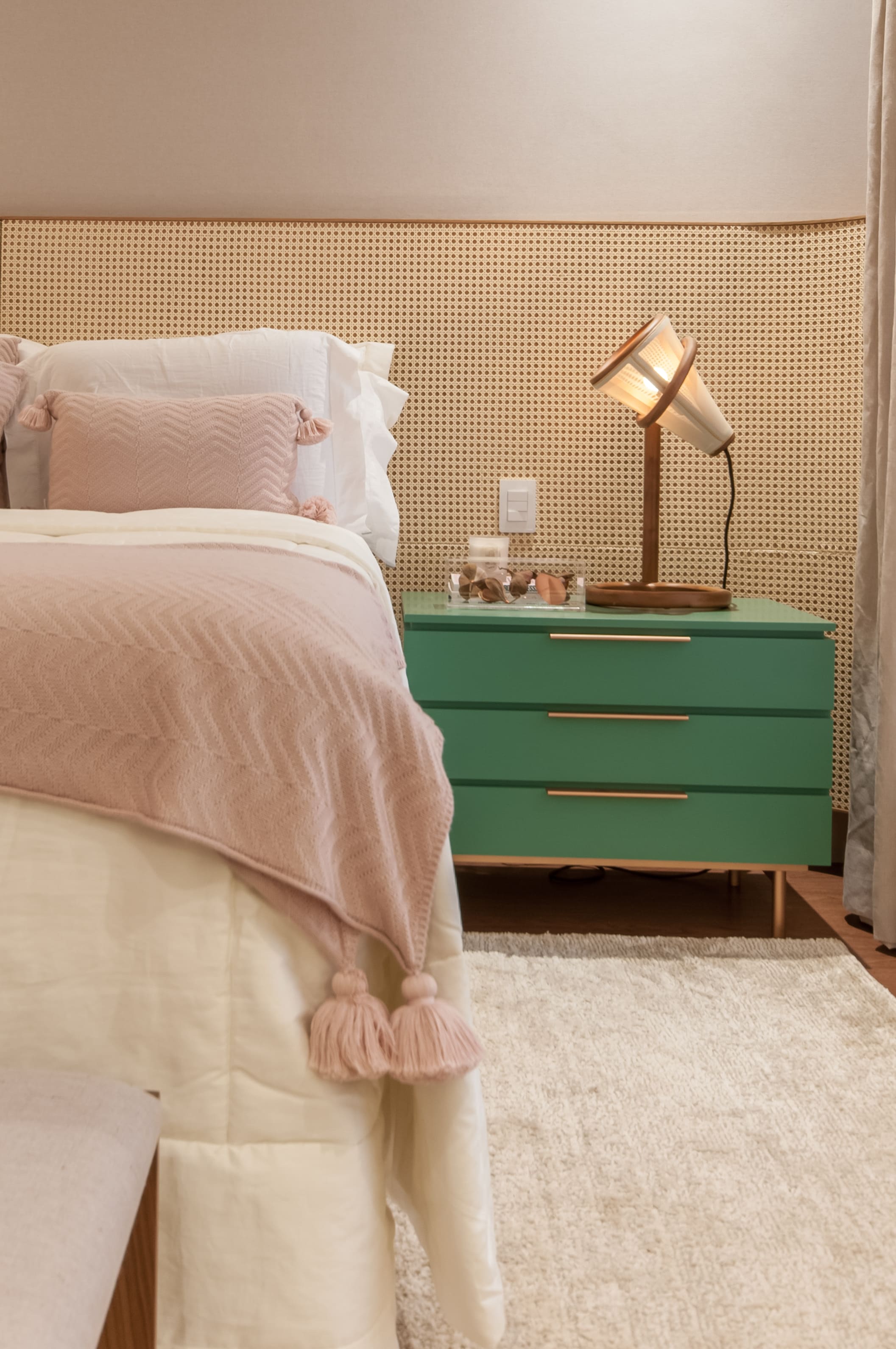 No dormitório de casal, o romantismo da palhinha contorna toda a cabeceira da cama. Nessa base de tons claros, o verde do móvel lateral promove uma fusão com referências naturais, alcançando o desejo das arquitetas: o clima aconchegante | Projeto Paiva e Passarini Arquitetura | Foto: Xavier Neto