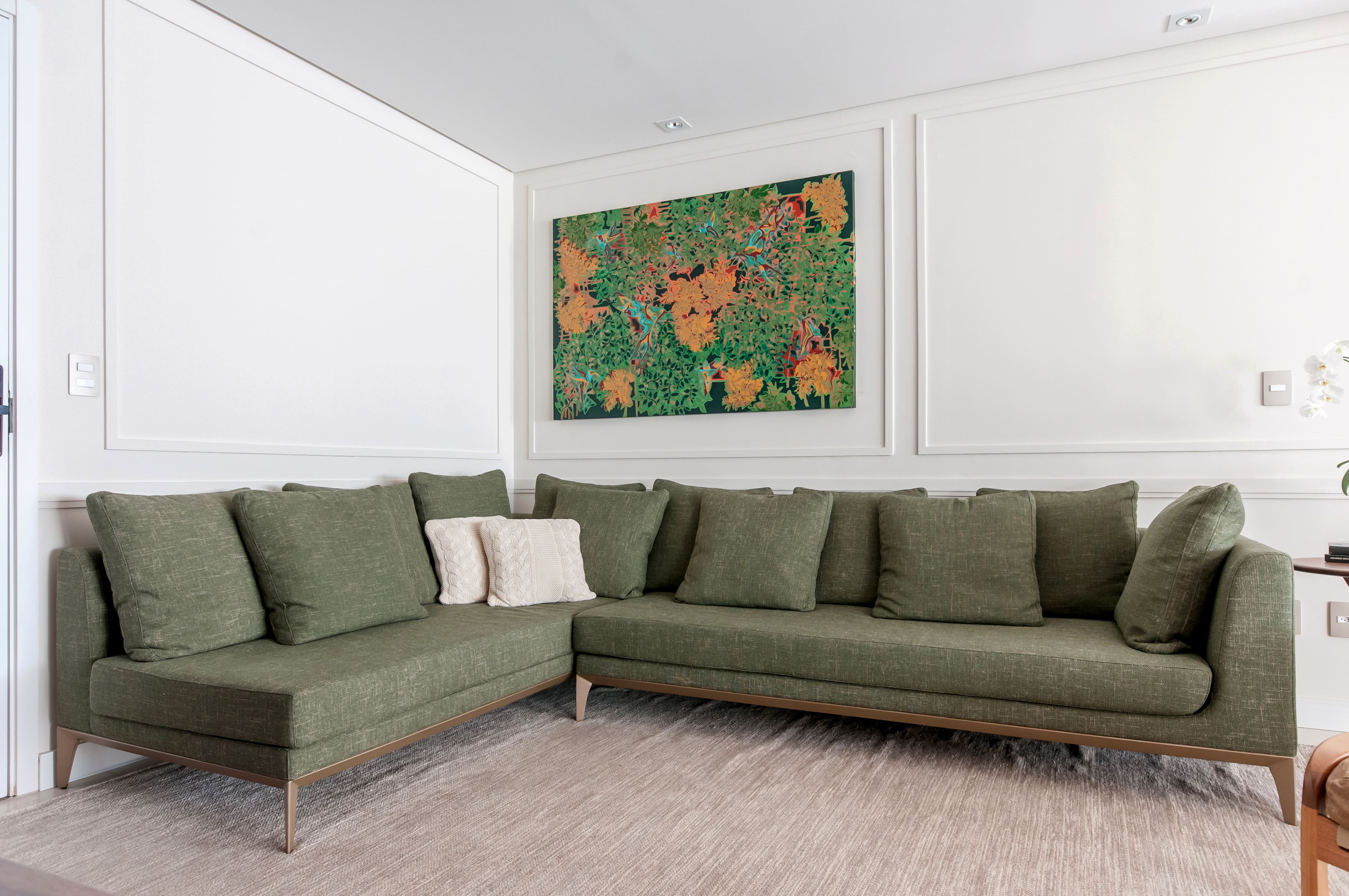 A versatilidade dos móveis e de tantos itens decorativos torna-se um facilitador para torná-los destaque com a escolha do verde. Mas é fundamental que a paleta esteja em consonância com o estilo do décor e, sobretudo, as predileções do morador. “Nessa psicologia do círculo cromático, em uma base neutra, o sofá verde pode entrar como o personagem principal do projeto para expressar uma ousadia sóbria e super elegante“, descreve Claudia. Ela ainda observa que, como qualquer outra cor, o desafio é nunca pecar pelo excesso e sempre conseguir o senso harmônico.