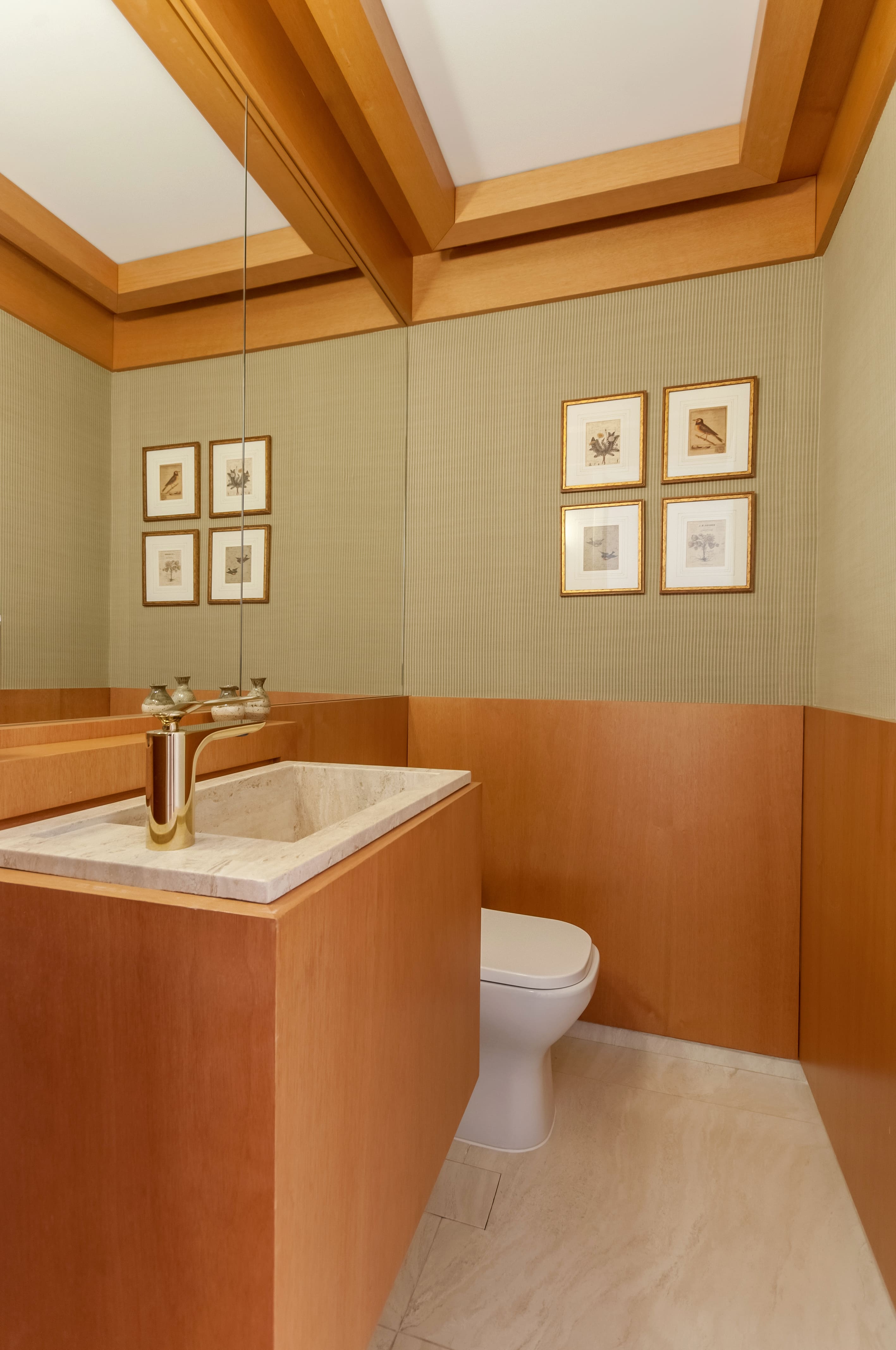 No lavabo desse apartamento, a sofisticação serena foi alcançada por Vanessa e Claudia por meio do mix entre a madeira, que adorna a meia parede, o forro e o móvel da bancada esculpida. O tecido de linho, em um verde gracioso, completa o deleite | Projeto Paiva e Passarini Arquitetura | Foto: Xavier Neto