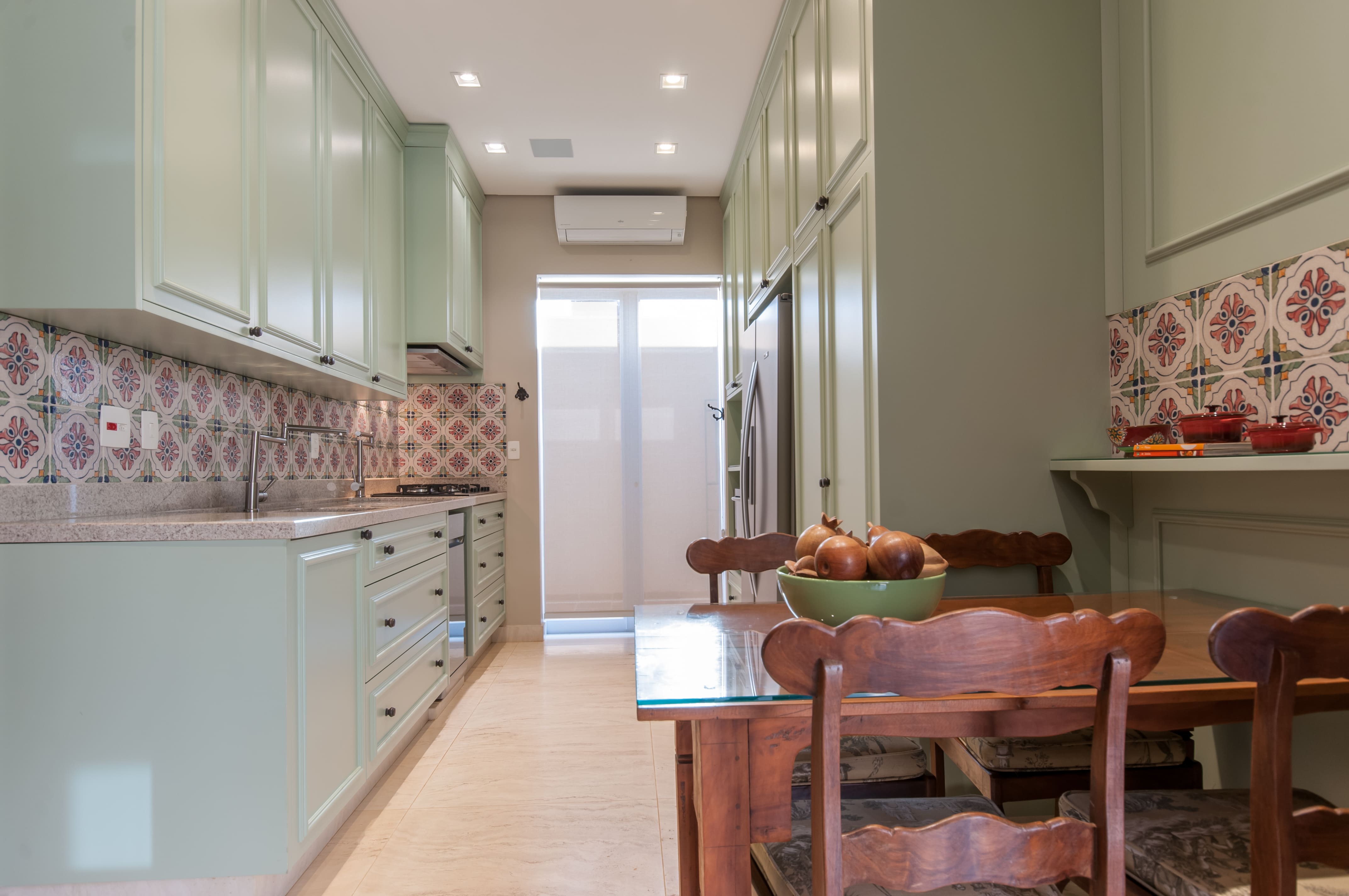 Nessa cozinha assinada pelas arquitetas Claudia e Vanessa, a marcenaria com estilo provençal recebeu a suavidade do verde menta com acabamento em laca. Com a inspiração de uma cozinha de fazenda, os moradores desfrutam de uma atmosfera convidativa para o café da manhã ou almoços cotidianos na copa incluída no projeto | Projeto Paiva e Passarini Arquitetura | Foto: Xavier Neto