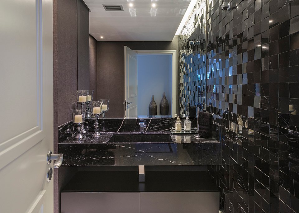 A intempérie de umidade pode causar danos estruturais e favorecer o crescimento de fungos e bolor. O uso de um exaustor foi crucial neste lavabo projetado pela arquiteta Carina Dal Fabro. Ele foi acoplado ao forro de drywall com uma sanca invertida iluminada, o que realçou a parede de mosaicos presente no ambiente | Foto: Priscila Amaral Santos |