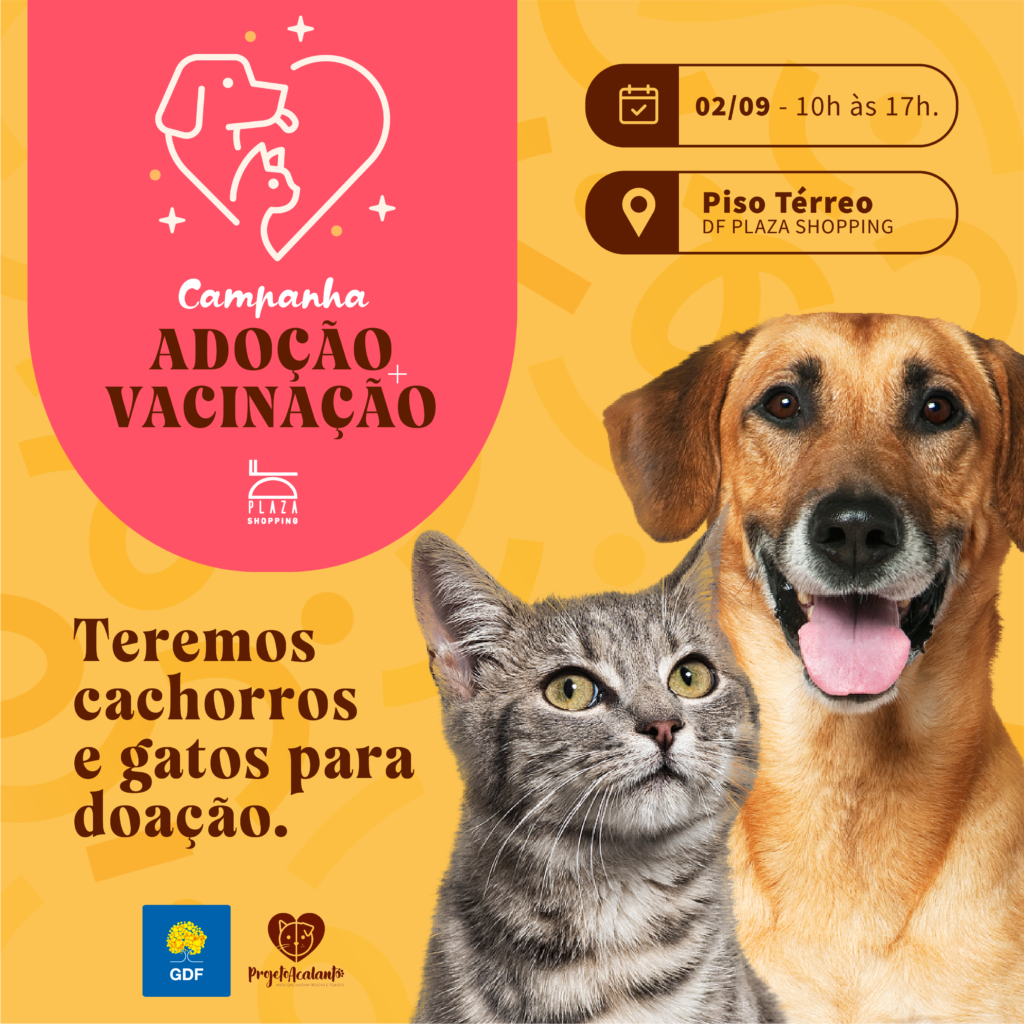 Sábado (2) será dia de cuidar dos animaizinhos, no DF Plaza Shopping. O complexo comercial, a Secretaria de Vigilância Ambiental e Saúde do Distrito Federal e o Projeto Acalanto se reuniram para uma tarde de proteção e amor. A Feira de Adoção e a atualização vacinal da antirrábica para cães e gatos, acontecerão no térreo do shopping, das 10h às 17h.