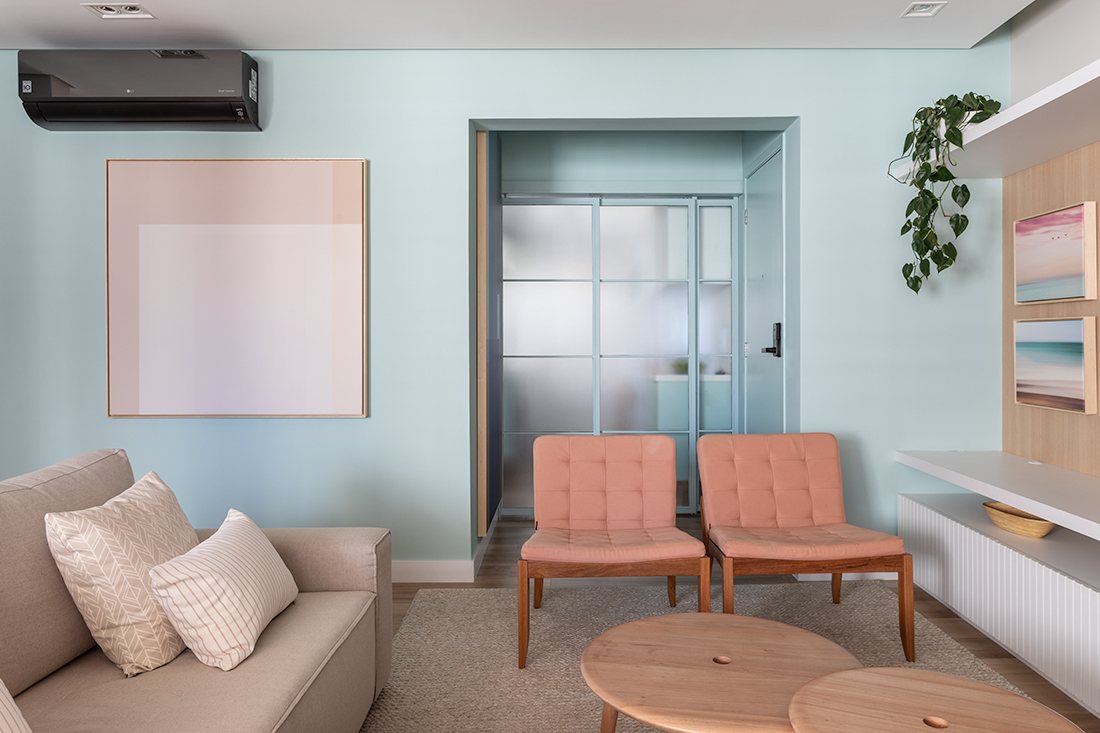Além de pensar nas cores que serão empregadas no ambiente, o morador precisa se atentar ao tipo de tinta ideal para a vida no imóvel. Em seus projetos, a arquiteta Marina Carvalho, se preocupa com a durabilidade e beleza do material. No caso desta sala de estar, o azul claro da tinta Suvinil, Mar Calmo foi eleito para promover a leveza esperada ao décor. |Fotos: Evelyn Müller |