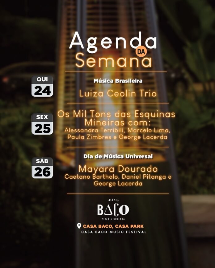 Na sexta (25/08), a “Casa Baco Music Festival” traz “Os mil tons das Esquinas Mineiras”. A cantora, Alessandra Terribili se junta a Marcelo Lima (violão e voz), Paula Zimbres (baixo e voz) e George Lacerda (percussão e voz) para celebrar a obra de Milton Nascimento e dos demais compositores do Clube da Esquina, como Lô Borges e Beto Guedes. O show é dançante e emocionante e repleto de clássicos como: Travessia, O Trem Azul, Paula e Bebeto e outros, com arranjos originais destacando o ritmo e as vozes.