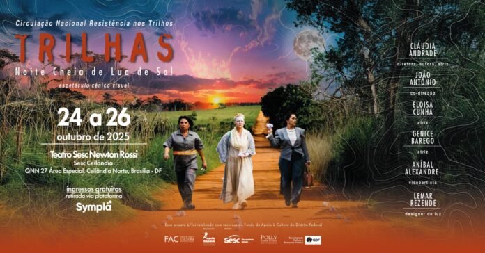 Encenada pela primeira vez em 2022, “Trilhas, Noite Cheia de Lua de Sol” inicia, em 24 de outubro de 2025, a partir do Distrito Federal, circulação nacional. Com texto, direção e atuação de Cláudia Andrade, o espetáculo cênico imagético é atravessado por elementos como a videoarte, música, dramaturgia contemporânea e as artes visuais. Na construção desse universo, cruzam-se os dilemas do feminino, a maturidade, os jogos de poder, a finitude e os contrastes sociais que moldam e desafiam a existência humana. Sob os holofotes estão os preconceitos arraigados em uma sociedade hipócrita e desigual, bem como o convite à libertação e redenção a partir do reconhecimento do outro em si mesmo. A turnê, com 12 apresentações, integra o projeto “Resistência nos Trilhos – Remontagem & Circulação”, contemplado pelo Fundo de Apoio à Cultura da Secretaria de Cultura e Economia Criativa do Distrito Federal (FAC-DF) e passa por Ceilândia (DF) – Teatro Sesc Newton Rossi; Vitória (ES) – Casa da Música Sônia Cabral; Belo Horizonte (MG) – Palácio das Artes; São Paulo (SP) – Teatro Ruth Escobar, e Brasília (DF) – Teatro Nacional Cláudio Santoro. As quatro primeiras apresentações, de 24 a 26 de outubro, na estreia, em Ceilândia, serão gratuitas.