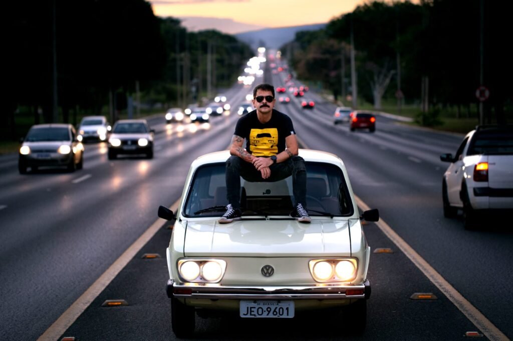 A imagem já desbotada, tirada em 1983, mostra Zukko, seus irmãos e o pai em cima do carro da família. Esta lembrança virou combustível para transformar uma VW Brasília em estúdio e em protagonista das entrevistas, com a cidade como trilha de fundo. Detalhe: A VW Brasília do programa foi adquirida especialmente para as entrevistas. Aquela, da família, já não existe faz tempo… infelizmente.