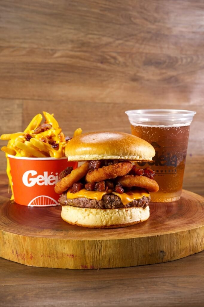 O combo é composto por um hambúrguer de 180g com blend de fraldinha e costela, queijo cheddar, molho barbecue premium, três anéis de cebola empanada, maionese especial da casa e pão australiano; e acompanha refrigerante lata e batata.