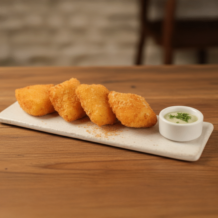 O Risole Flor do Cerrado (R$42) é preparado com purê de mandioca recheado com carne de sol, empanado e frito até alcançar a crocância perfeita. A porção traz seis unidades e é servida com maionese de ervas, combinação que reforça a proposta da casa de unir sabores típicos do Nordeste com elementos do Cerrado.