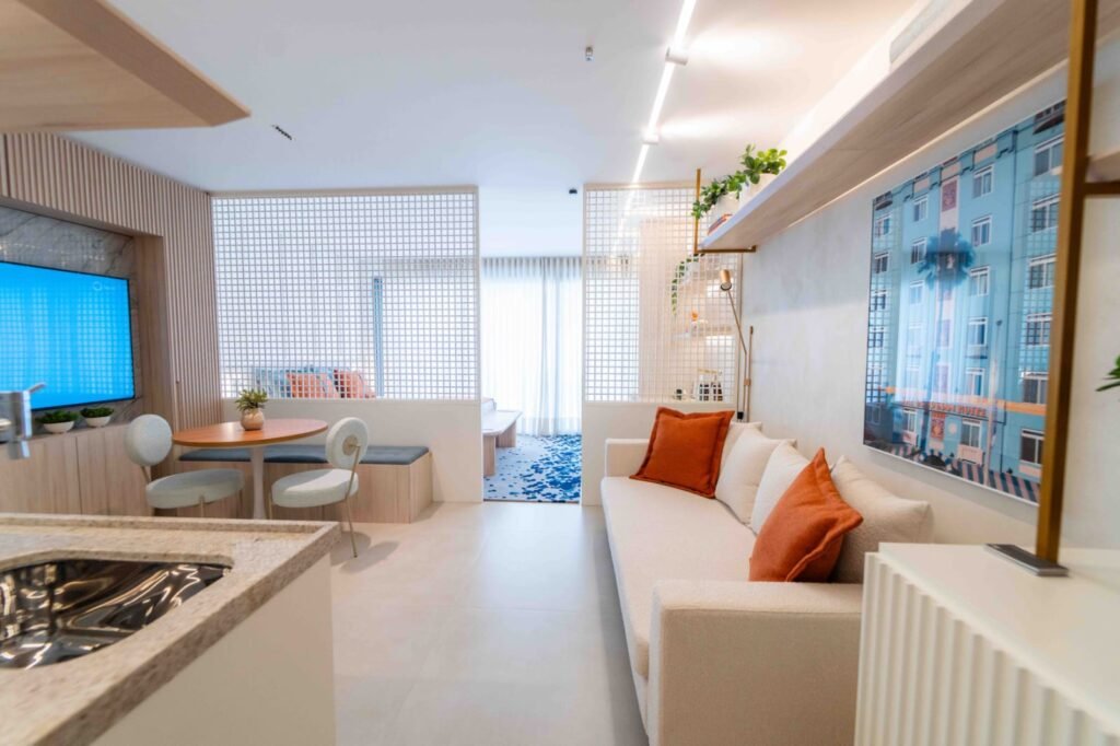 “A inspiração veio do próprio lago. Os tons de coral refletem o pôr do sol, o verde e o azul aparecem conforme a luz muda sobre a água. Usei essas cores para trazer esse clima de orla, de paz, para dentro do decorado. A madeira clara lembra a areia, os tapetes têm formas orgânicas, como se a água tivesse passado por ali. Quis criar essa sensação de acolhimento, de leveza”, explica a arquiteta.