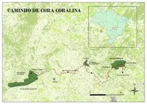 Mapa do Caminho de Cora Coralina, trilha de longo curso com cerca de 300 km que conecta Corumbá de Goiás à Cidade de Goiás, atravessando áreas preservadas do Cerrado, unidades de conservação e municípios históricos, e consolidando-se como eixo de turismo ativo no Centro-Oeste.